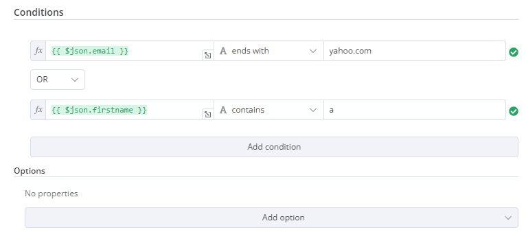 {displayName:'Conditions',name:'conditions',placeholder:'Add Condition',type:'filter',default:{},typeOptions:{filter:{// Use the user options (below) to determine filter behaviorcaseSensitive:'={{!$parameter.options.ignoreCase}}',typeValidation:'={{$parameter.options.looseTypeValidation ? "loose" : "strict"}}',},},},{displayName:'Options',name:'options',type:'collection',placeholder:'Add option',default:{},options:[{displayName:'Ignore Case',description:'Whether to ignore letter case when evaluating conditions',name:'ignoreCase',type:'boolean',default:true,},{displayName:'Less Strict Type Validation',description:'Whether to try casting value types based on the selected operator',name:'looseTypeValidation',type:'boolean',default:true,},],},