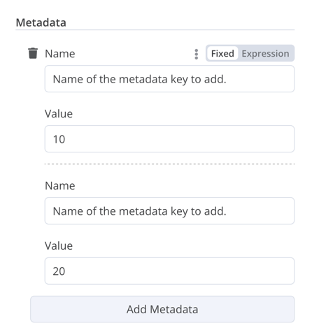{displayName:'Metadata',name:'metadataUi',placeholder:'Add Metadata',type:'fixedCollection',default:'',typeOptions:{multipleValues:true,},description:'',options:[{name:'metadataValues',displayName:'Metadata',values:[{displayName:'Name',name:'name',type:'string',default:'Name of the metadata key to add.',},{displayName:'Value',name:'value',type:'string',default:'',description:'Value to set for the metadata key.',},],},],displayOptions:{// the resources and operations to display this element withshow:{resource:[// comma-separated list of resource names],operation:[// comma-separated list of operation names]}},}